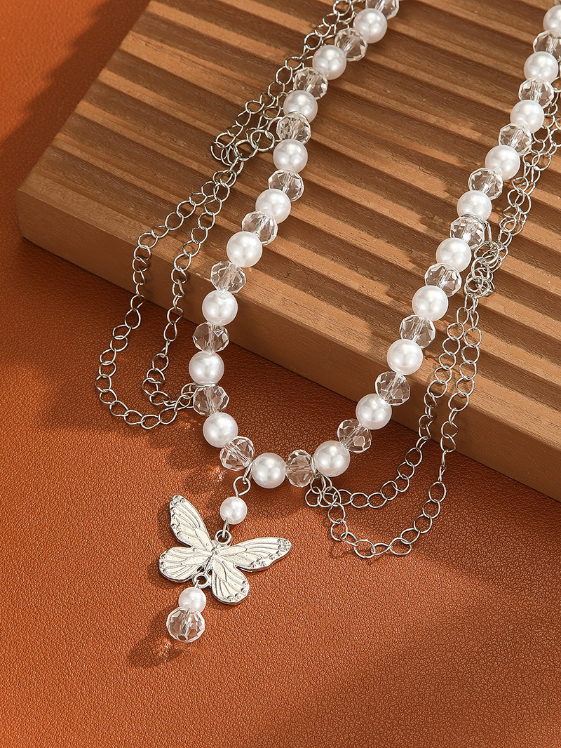 Add a touch of ethereal charm to your look with this multi-layered pearl and crystal butterfly necklace. The combination of lustrous pearls, sparkling crystals, and sleek silver-tone chains creates a delicate, dimensional effect, while the intricate butterfly pendant adds a whimsical, feminine finish. Designed with staggered layers for rich visual depth, it pairs beautifully with dresses, blouses, and more. Perfect for dates, brunch, or casual outings, this versatile piece elevates any outfit with its romantic, dreamy vibe.