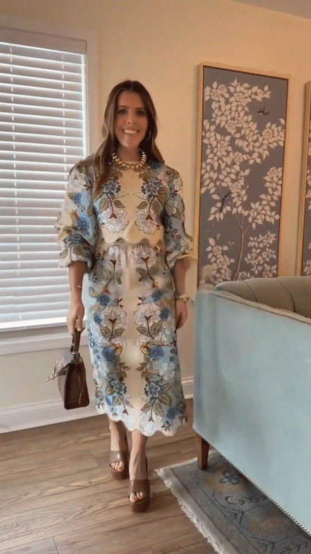 The Garden Scarf Blue Blouse features eye-catching floral print, long sleeves, and a softly scalloped hem for a refined finish. Style it with the matching Garden Scarf Blue Skirt for a coordinated look—perfect for daytime events, or or polished day-to-night style.