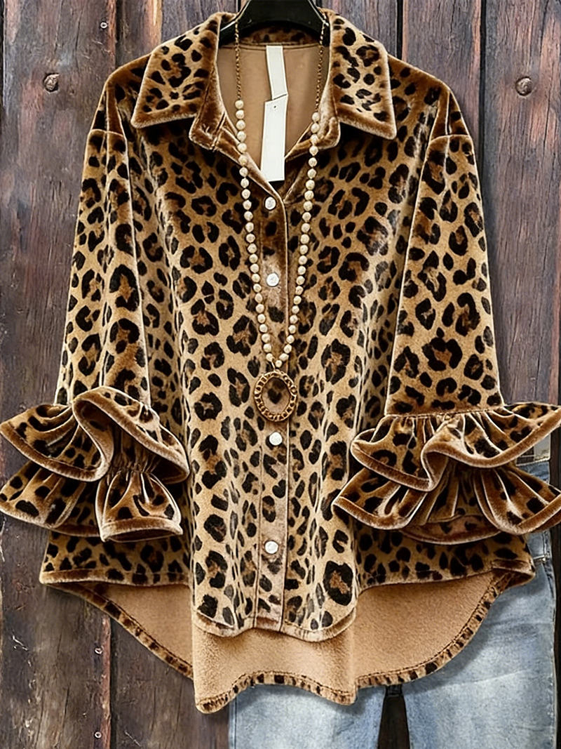 The brown leopard print velvet has a naturally soft sheen, and its relaxed texture is wrapped in a wild tension; the double-layered ruffled cuffs are the key design element, and the fluffy curves are full of retro sweet and cool vibes; the shirt-style collar and button-down front placket balance casualness and sophistication.