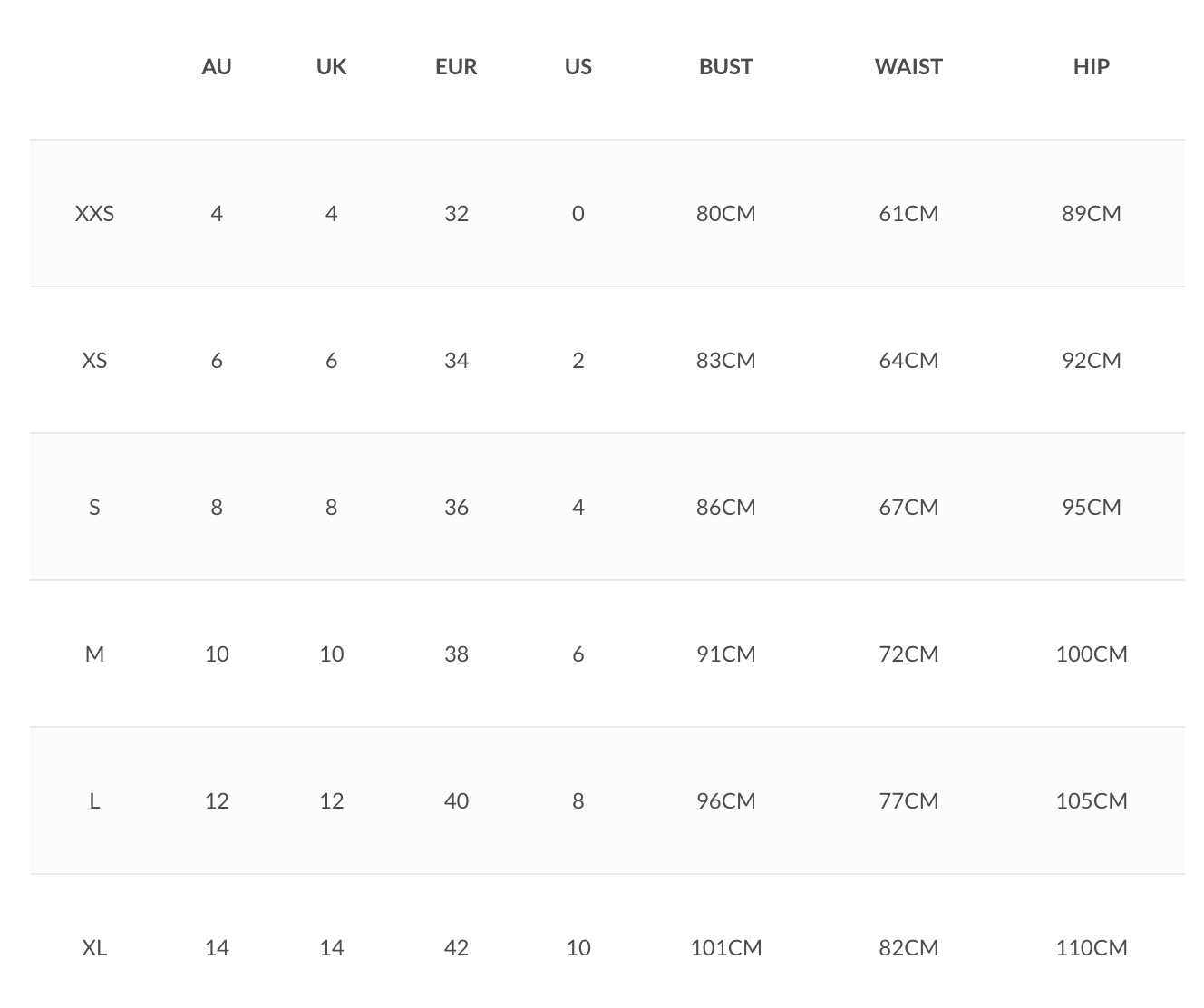 - (Model 1): Size XS , Height: 173/5’8, Bust: 76/30, Waist, 58/23, Hips: 90.5/35.5
