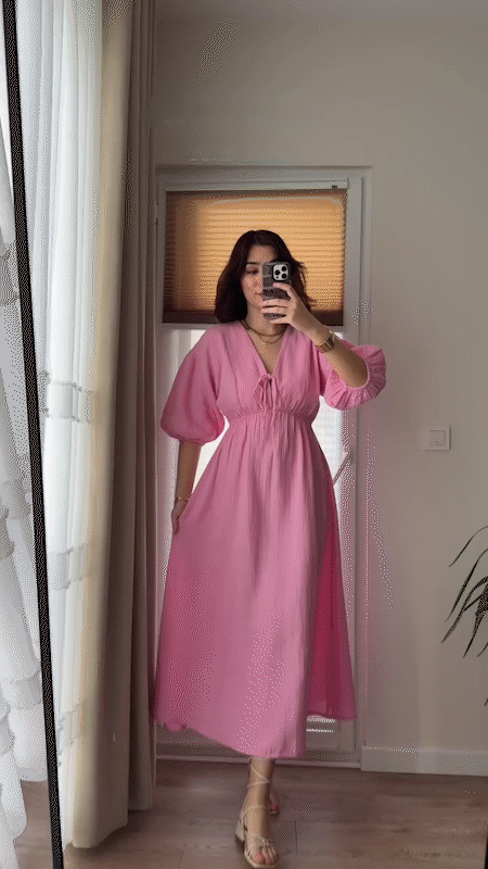 This long dress features a stylish V-neck, puff sleeves, and a high waistline, creating a flowing and graceful silhouette. A casual long dress with a tie-up design.