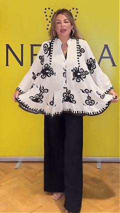 This V-neck blouse adds a touch of charm and elegance to your look. Featuring a captivating abstract print that highlights your unique style, it’s finished with elegant flared sleeves and a classic button-up design—an ideal addition to your summer wardrobe.