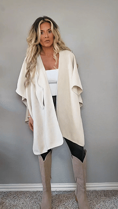 The loop is on the chest,cross-front design adds a touch of sophistication to the classic poncho silhouette.It drapes beautifully,creating a flattering and chic look that can easily transition from casual outings to more dressy occasions.